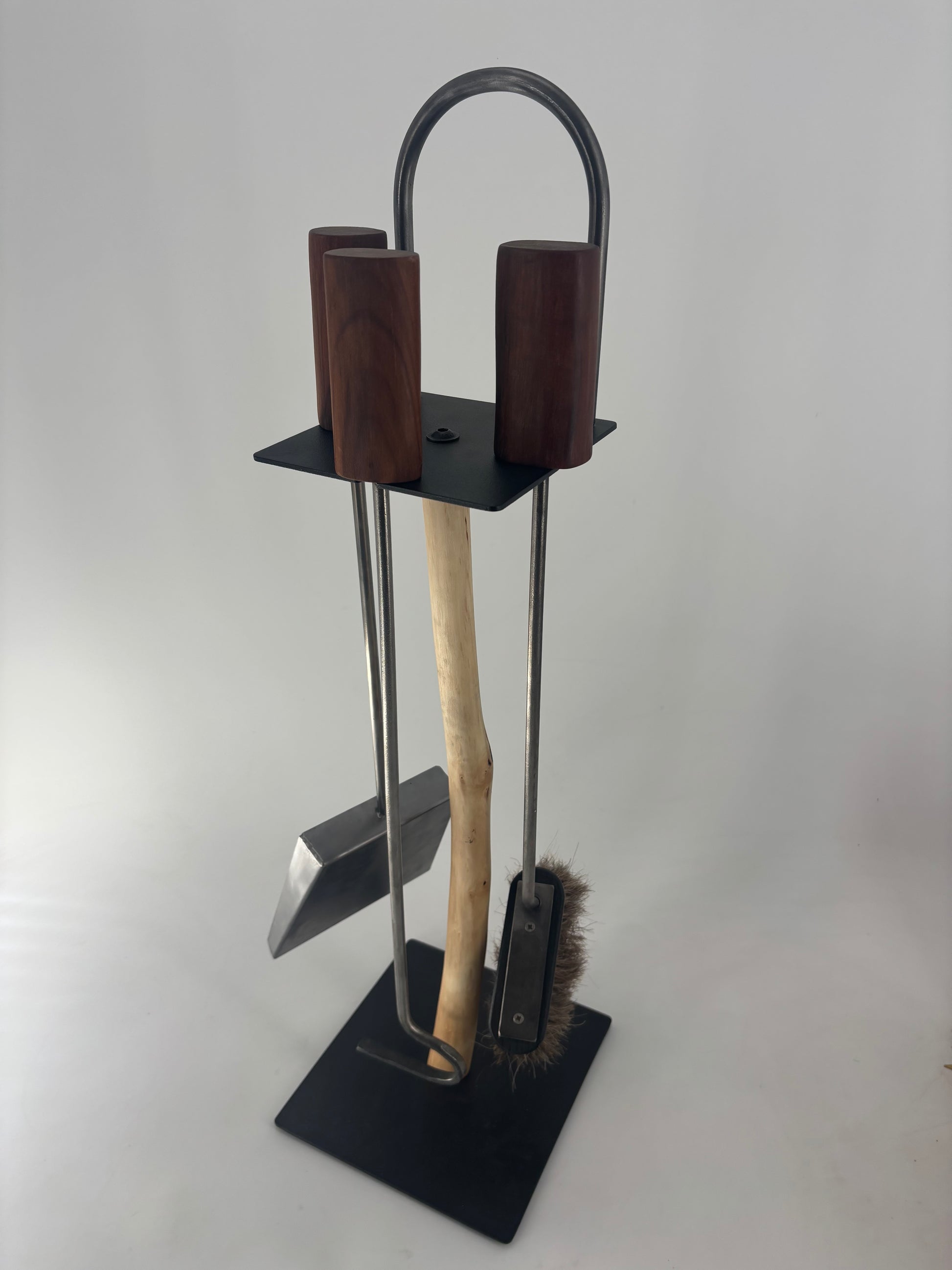 Der Schürhaken ist Handgeschmiedet, der Besen aus Naturhaaren, alle Oberflächen sind geölt und die beiden Platten sind Pulverbeschichtet.