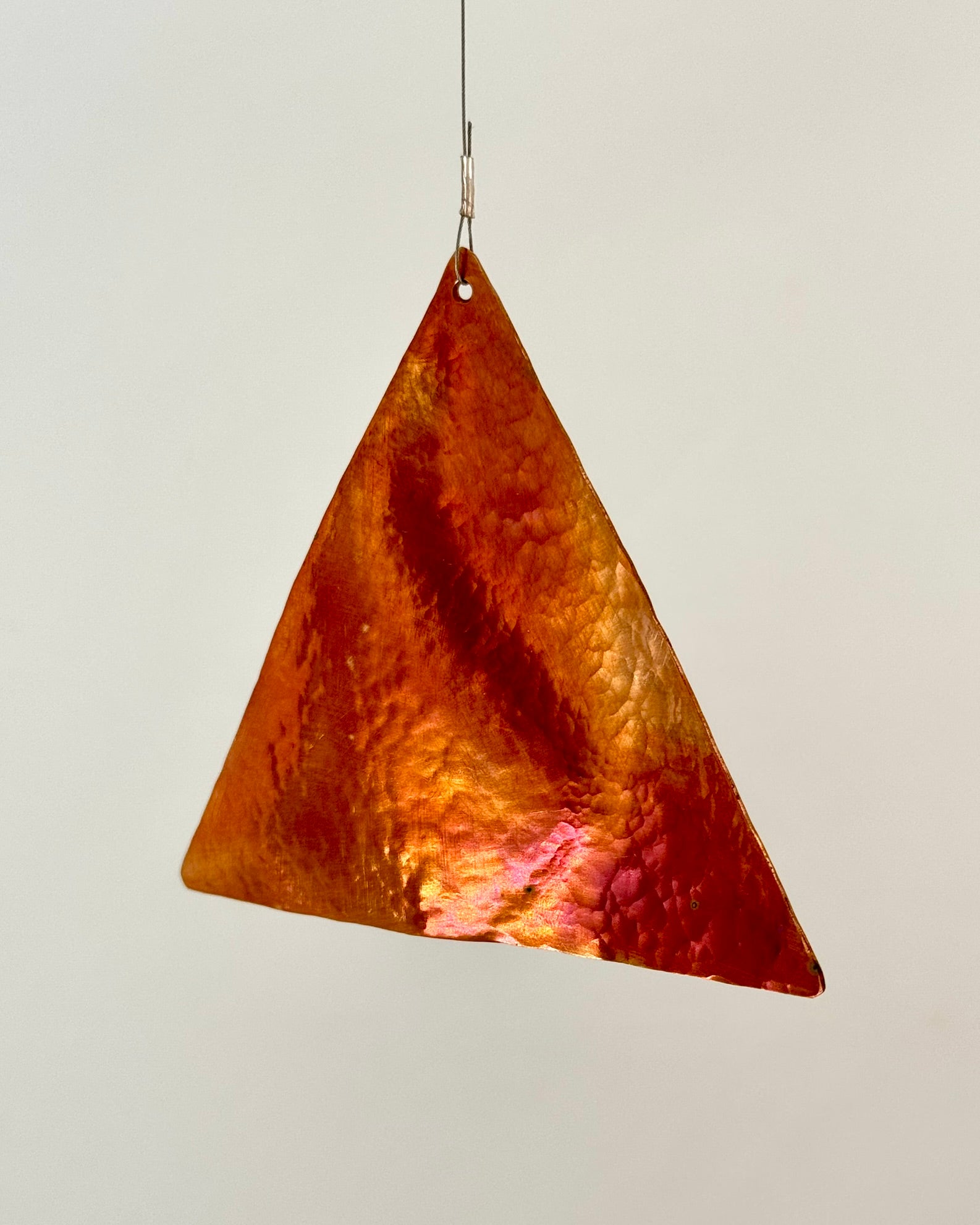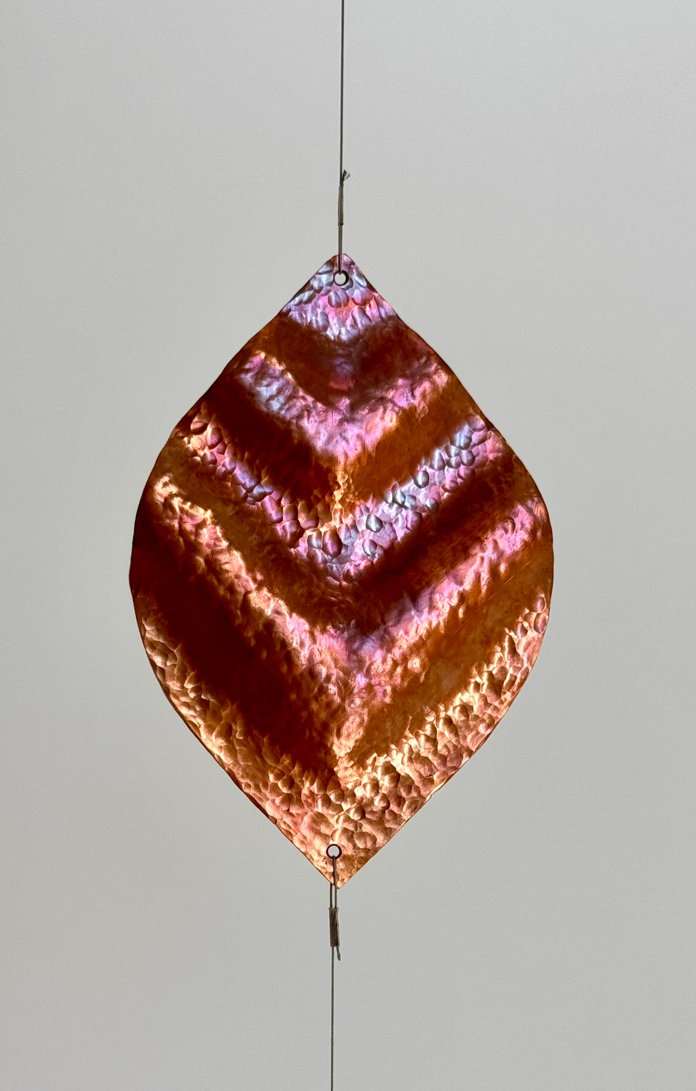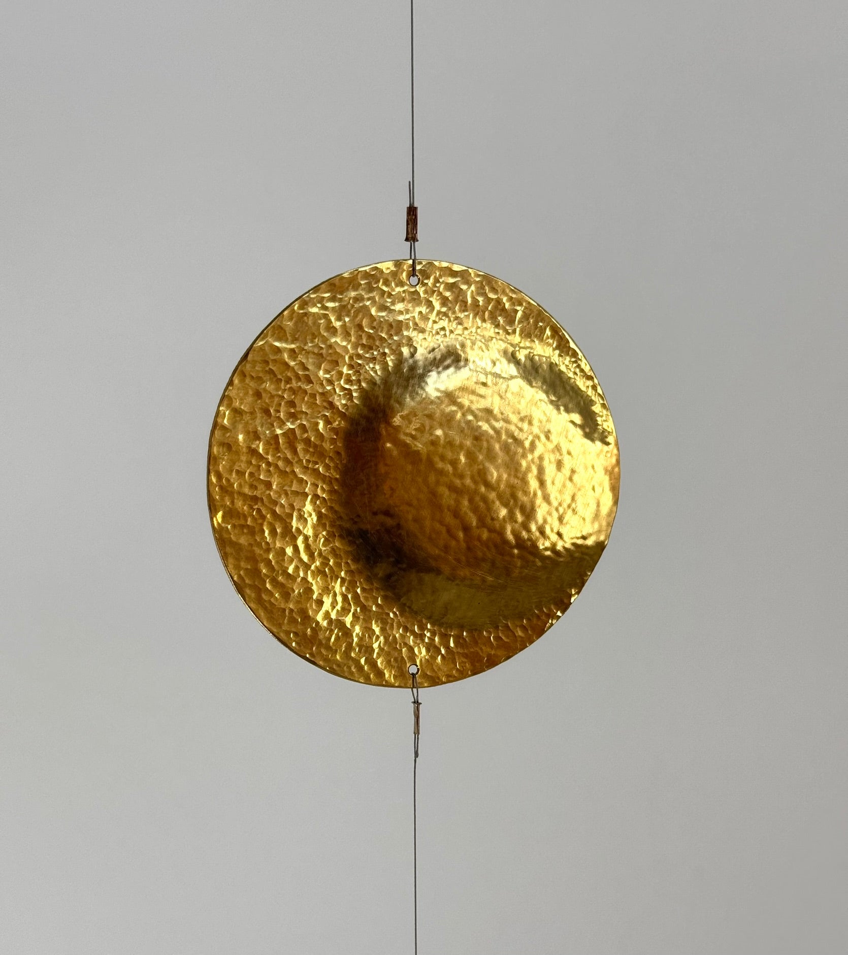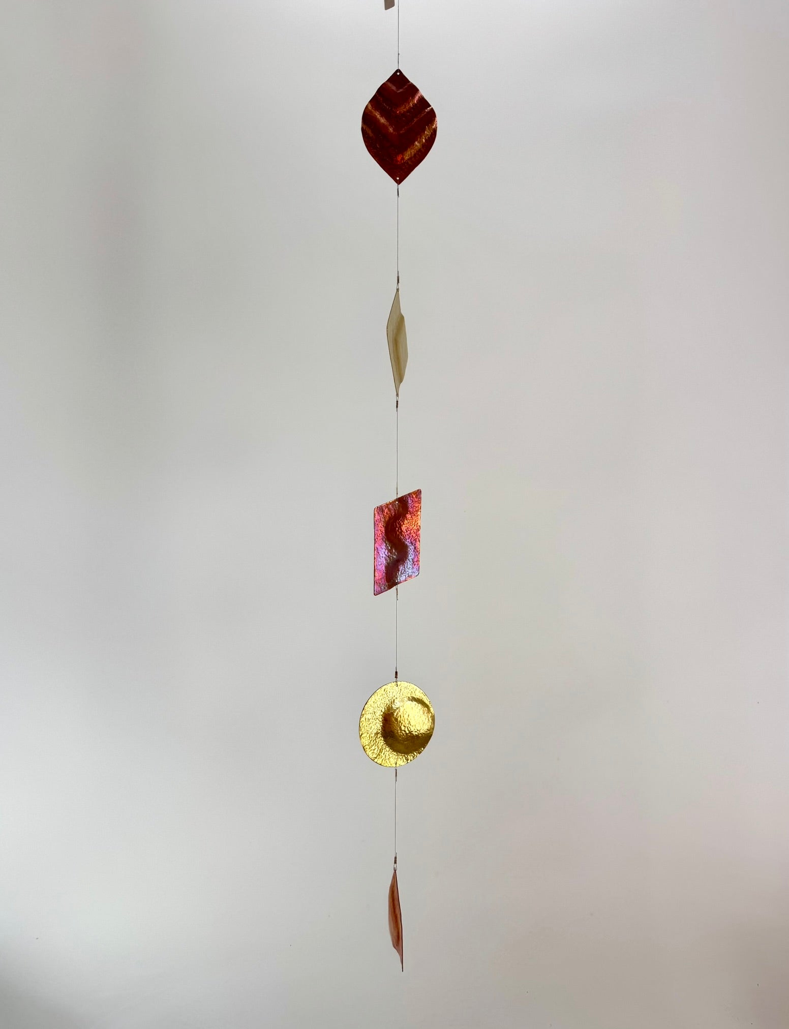 Dekoratives mobile Einzelstrangig, bestehend aus fünf unterschiedlichen, fein gehämmerten Elementen aus Kupfer und Messing.