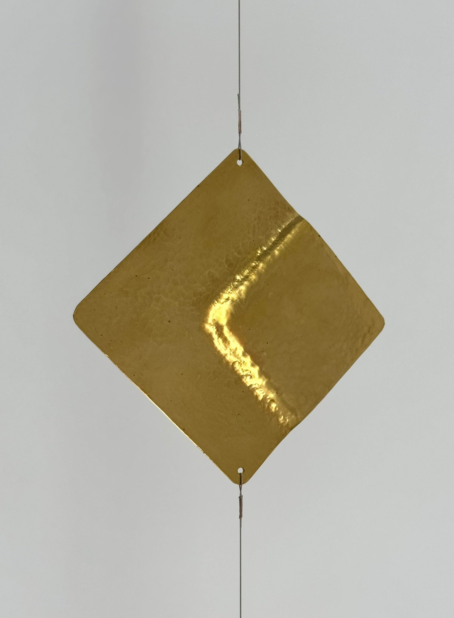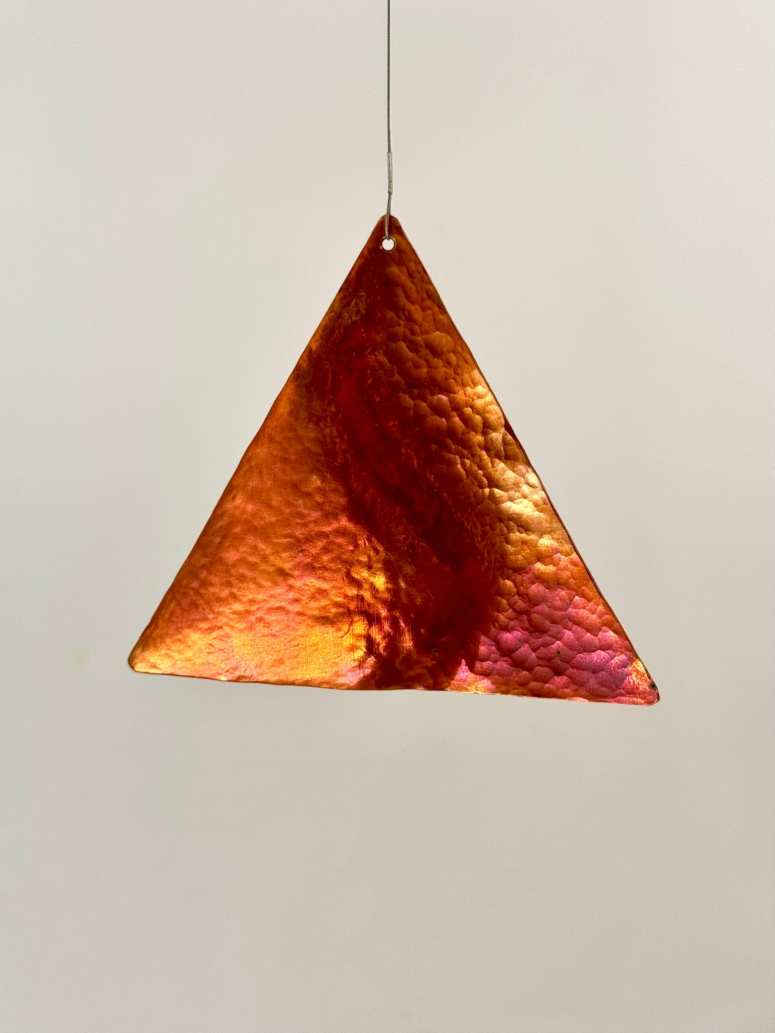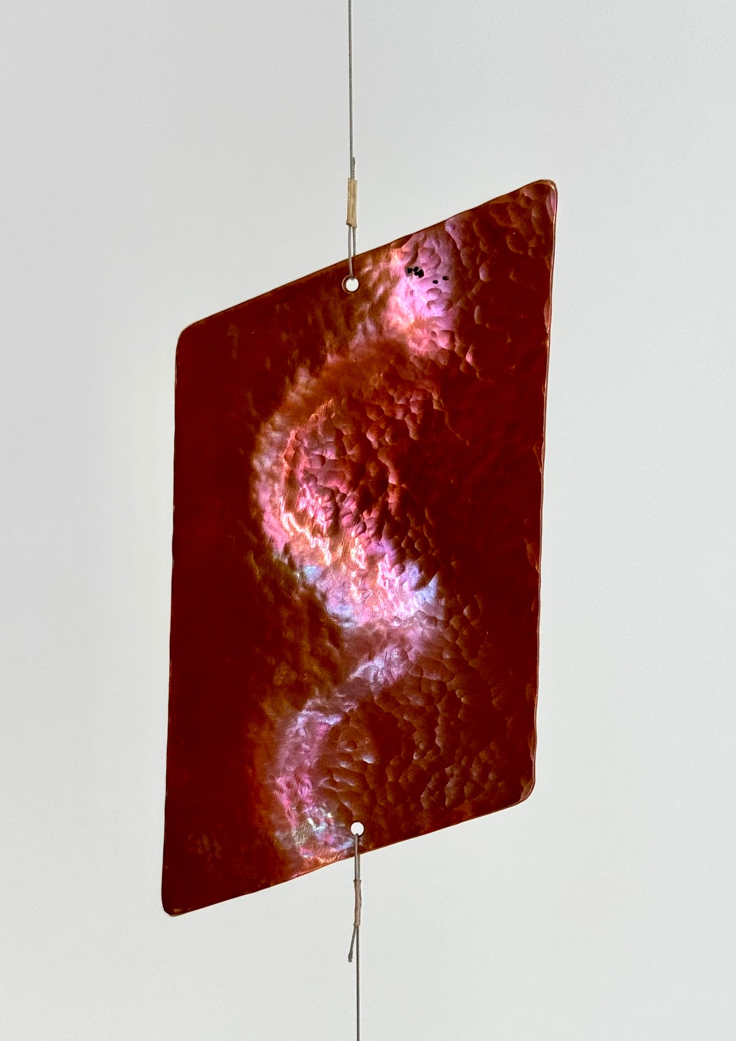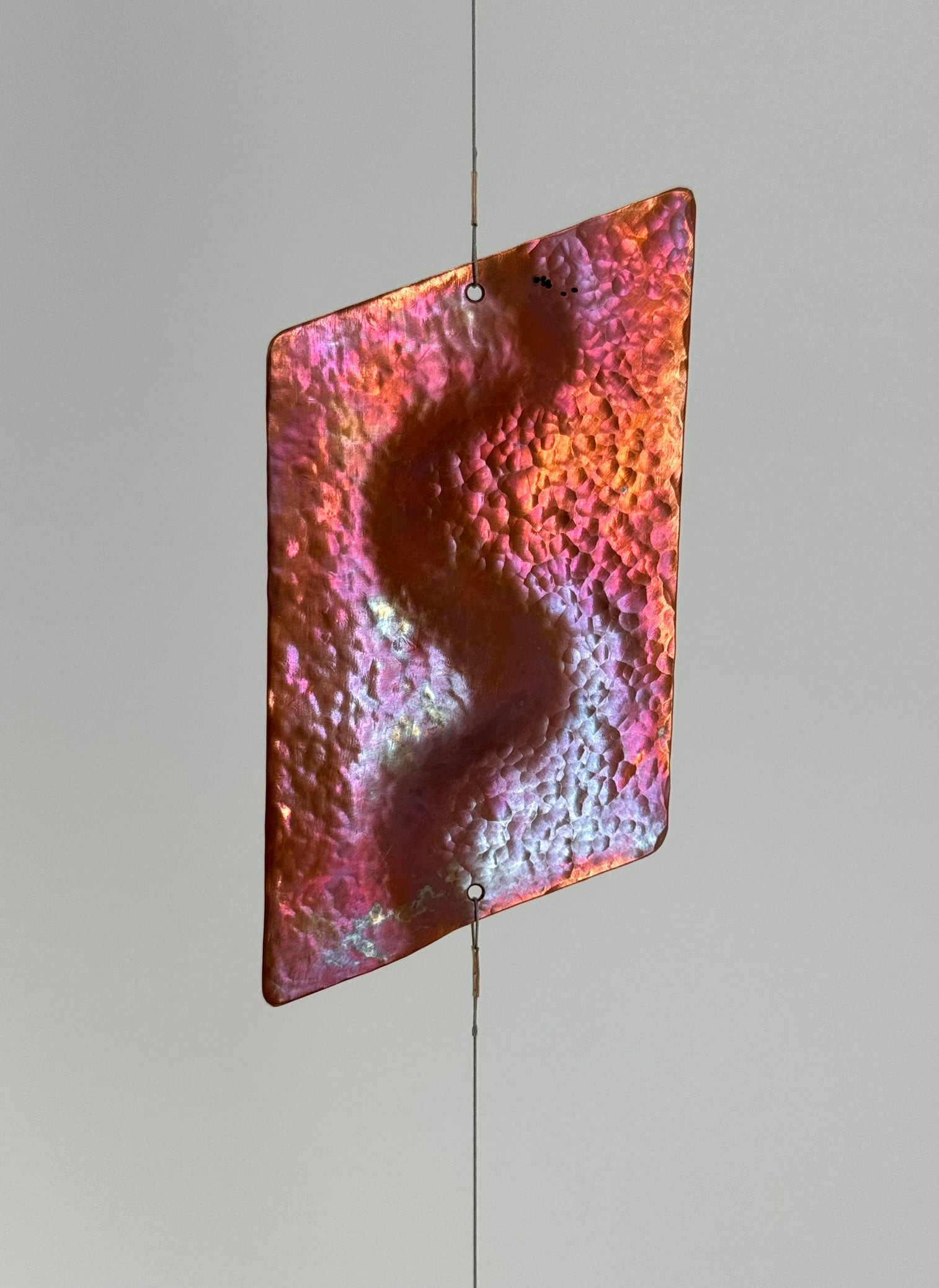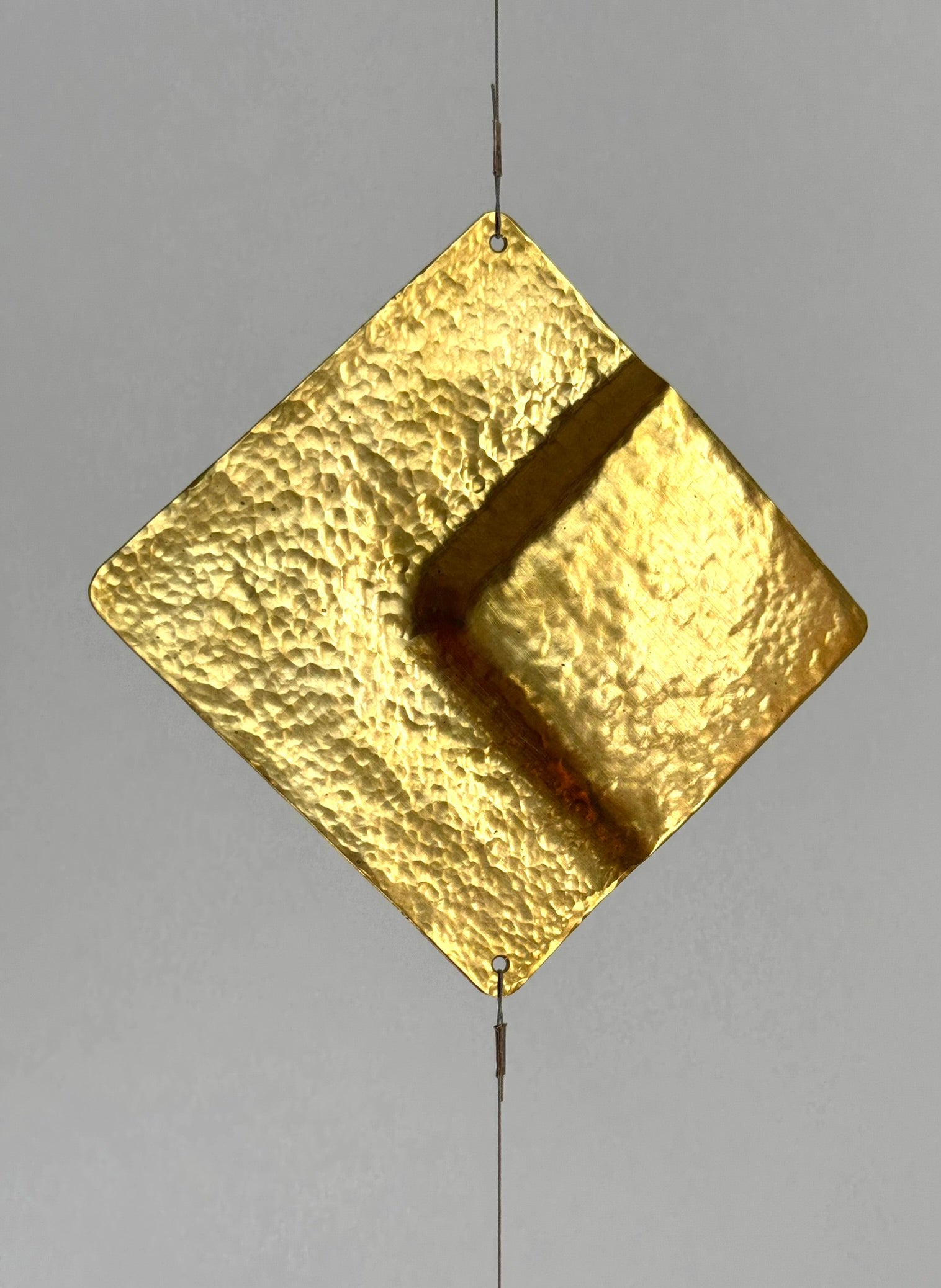 Dekoratives mobile Einzelstrangig, bestehend aus fünf unterschiedlichen, fein gehämmerten Elementen aus Kupfer und Messing.